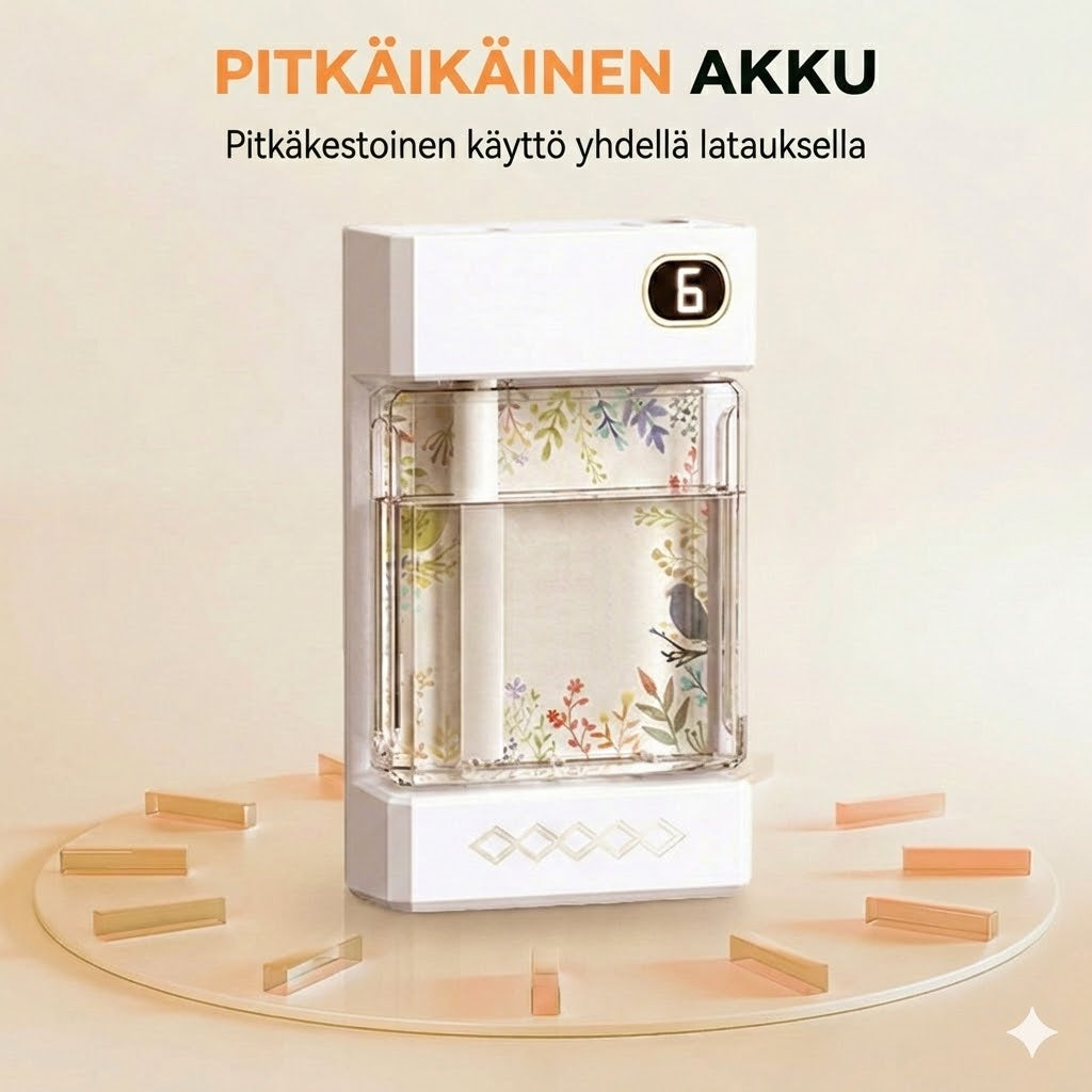 Tehokas ultraäänisumuteknologia Tämä teknologia luo hienon ja tiheän sumun, joka levittää tuoksun tasaisesti koko tilaan. Tämän ansiosta ympäristösi raikastuu nopeasti luonnollisella ja rauhoittavalla aromilla, mikä luo välittömästi miellyttävän ilmapiirin kotiisi.